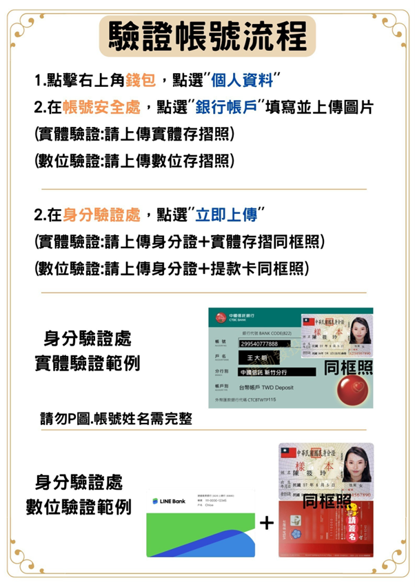 在身分驗證處點擊''立即上傳'',請上傳身分證+存摺同框照,兩個都完成上傳後私訊官方LINE需要審核驗證。